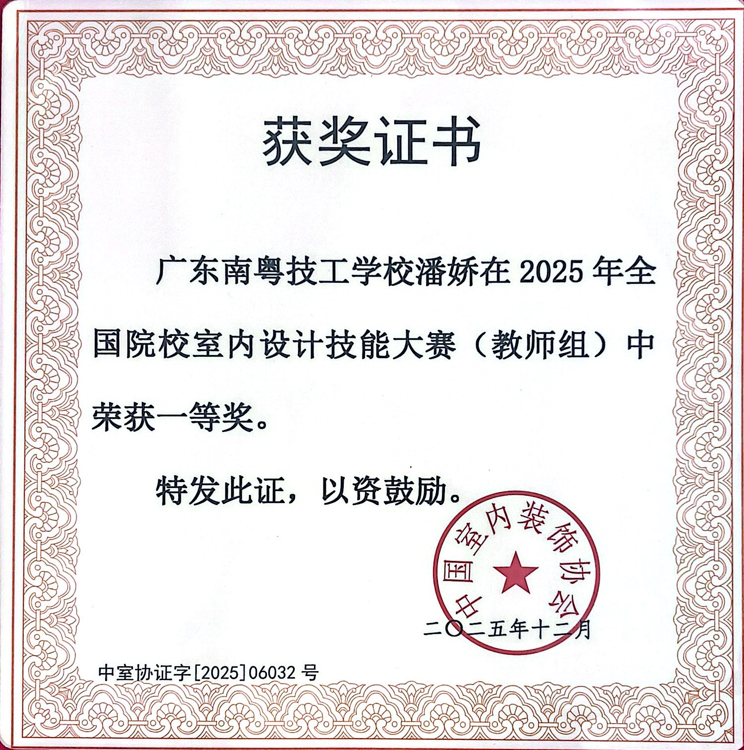 近日,2025年全国院校室内设计技能大赛总决赛圆满落幕。本次大赛吸引全国20余个省份百余所院校的教师同台竞技,是室内设计领域规格高、影响力大的权威赛事。我校潘娇老师凭借深厚的专业功底、前沿的设计理念与稳健的现场发挥,从全国众多参赛选手中脱颖而出,一举斩获教师组“一等奖”,以过硬实力彰显了我校教师队伍的专业风采与育人担当!