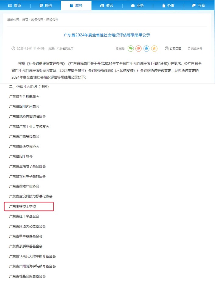 【喜报】AAAA!广东南粤技工学校获评全省性4A级社会组织称号广东南粤技工学校广东南粤技工学校2025年12月9日 18:23广东GOOD NEWS热烈祝贺XI喜BAO报AAAA!广东南粤技工学校获评全省性4A级社会组织称号AAAA根据民政部《社会组织评估管理办法》和《广东省民政厅关于开展2024年度全省性社会组织评估工作的通知...