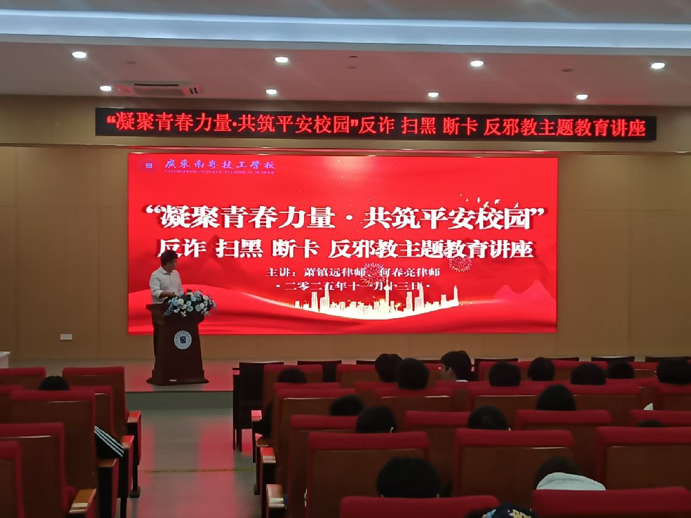 凝聚青春力量·共筑平安校园 | 我校开展反诈、扫黑、断卡、反邪教主题教育讲座广东南粤技工学校广东南粤技工学校2025年11月14日 17:09广东青春向阳而生,平安保驾护航。为进一步筑牢校园安全防线,提升全体师生的安全防范意识与自我保护能力,2025年11月13日14:00在学术报告厅开展了一场“凝聚青春力量·...
